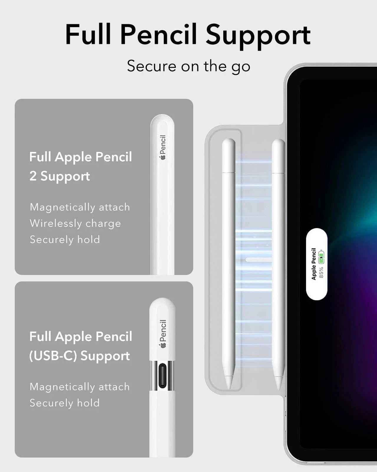 Unterstützt Pencil Pro und Pencil (USB-C): Diese iPad Hülle unterstützt den Pencil Pro und Pencil (USB-C) vollständig und verfügt über eine vertiefte Seitenrille zum magnetischen Laden und einen Magnetverschluss, um Ihren Pencil sicher zu halten