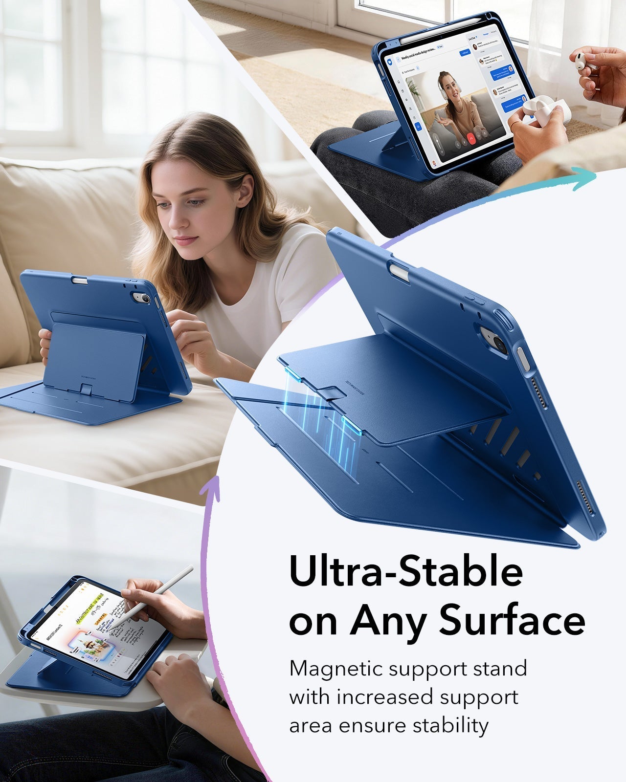 Three angle options in landscape mode give you the right setup for everything—watching movies, writing, or video calls. Flip it vertically for browsing. The case holds your stylus without interfering with magnetic charging and keeps it surprisingly stable even on soft surfaces like your couch, bed, or lap—no more slipping.