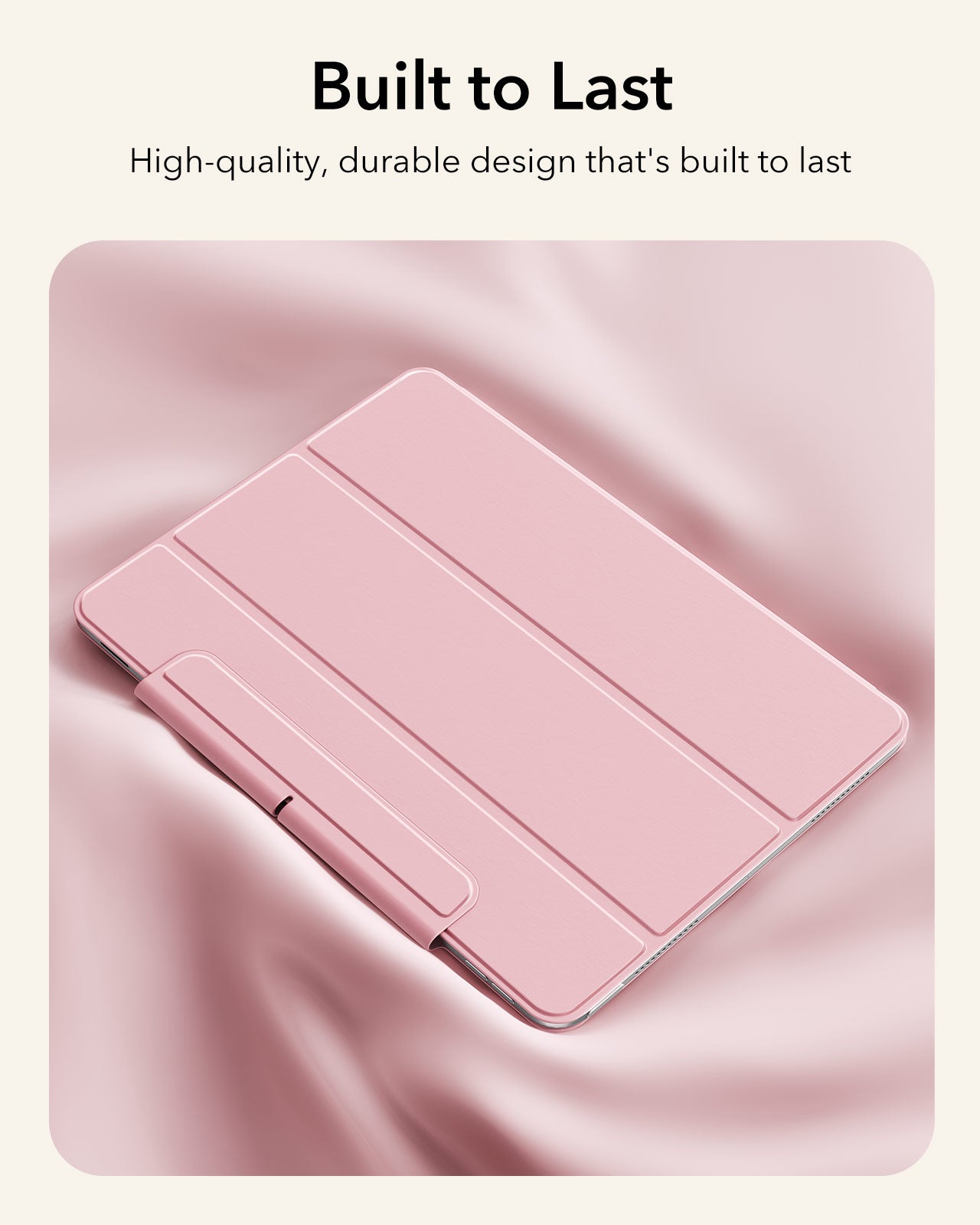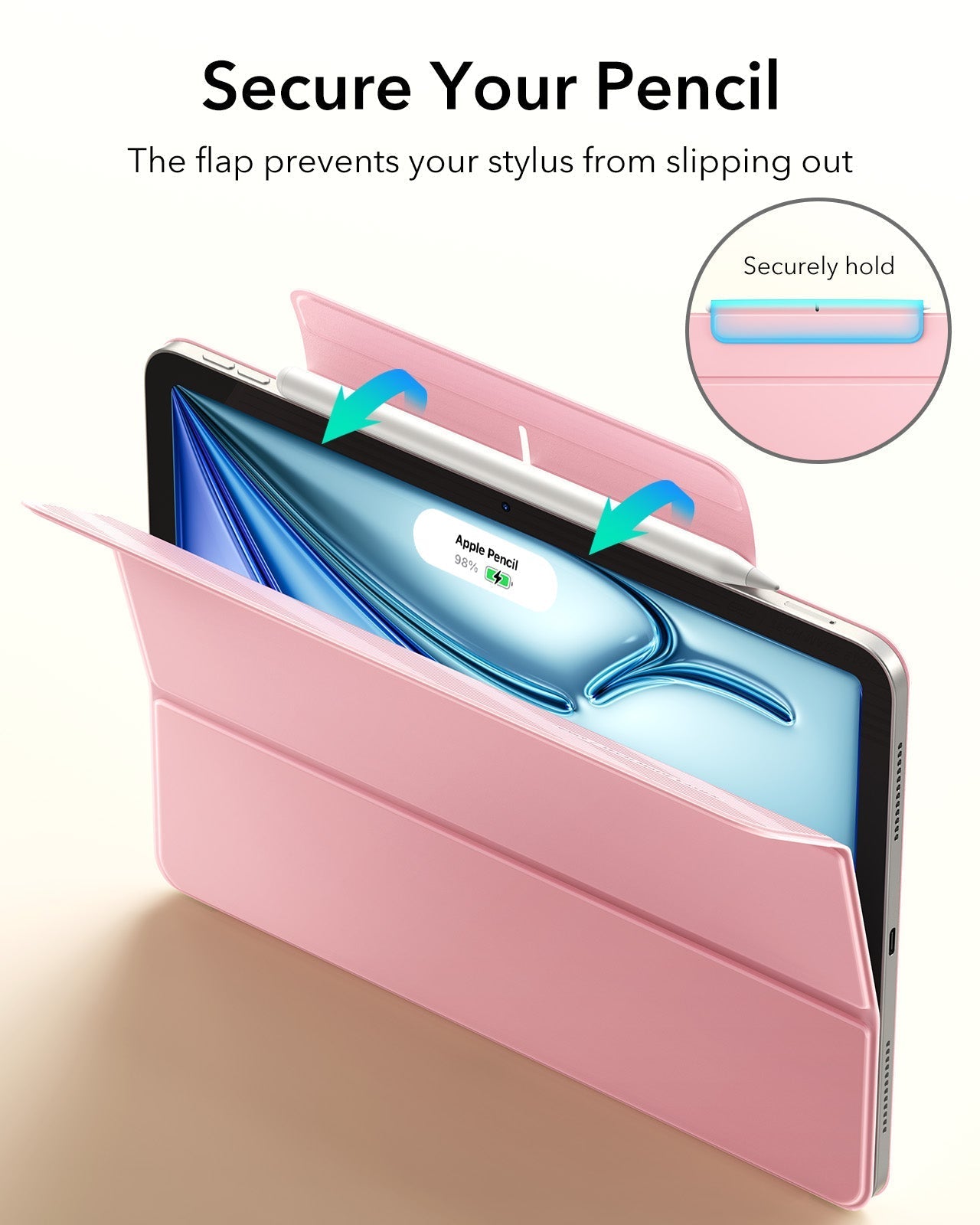 This iPad case features a strong magnetic attachment, durable materials for long-lasting use, and full support for Apple Pencil Pro with wireless charging compatibility. Its slim, lightweight design offers easy portability, while the front cover doubles as a stable stand for viewing, typing, and drawing.