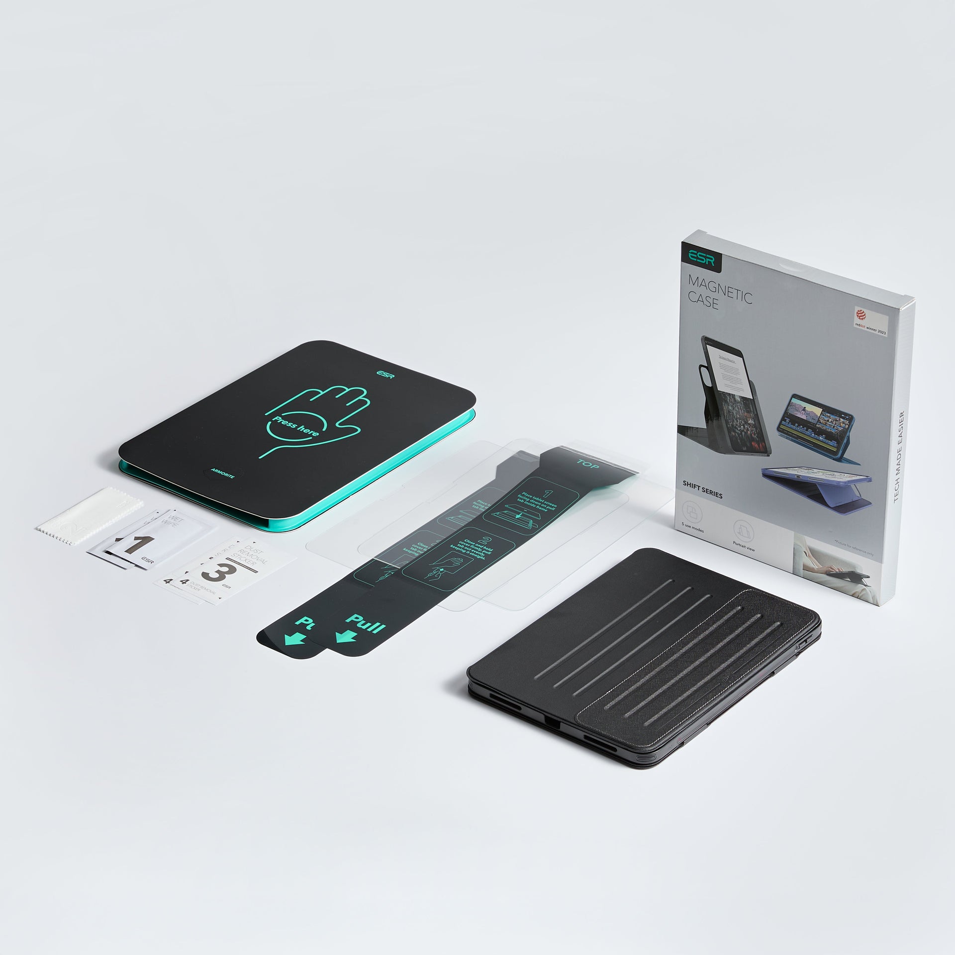 In the Box: Shift Magnetic Case, 2 Armorite® Screen Protectors, cleaning kits, and installation tray