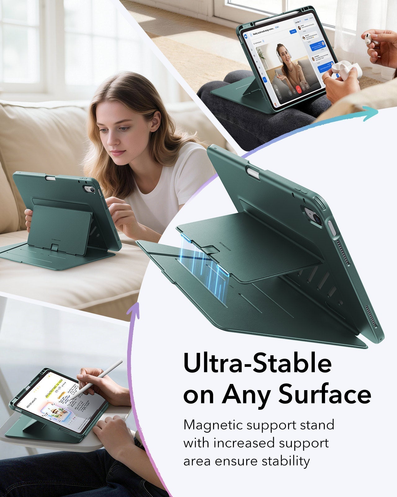 Three angle options in landscape mode give you the right setup for everything—watching movies, writing, or video calls. Flip it vertically for browsing. The case holds your stylus without interfering with magnetic charging and keeps it surprisingly stable even on soft surfaces like your couch, bed, or lap—no more slipping.