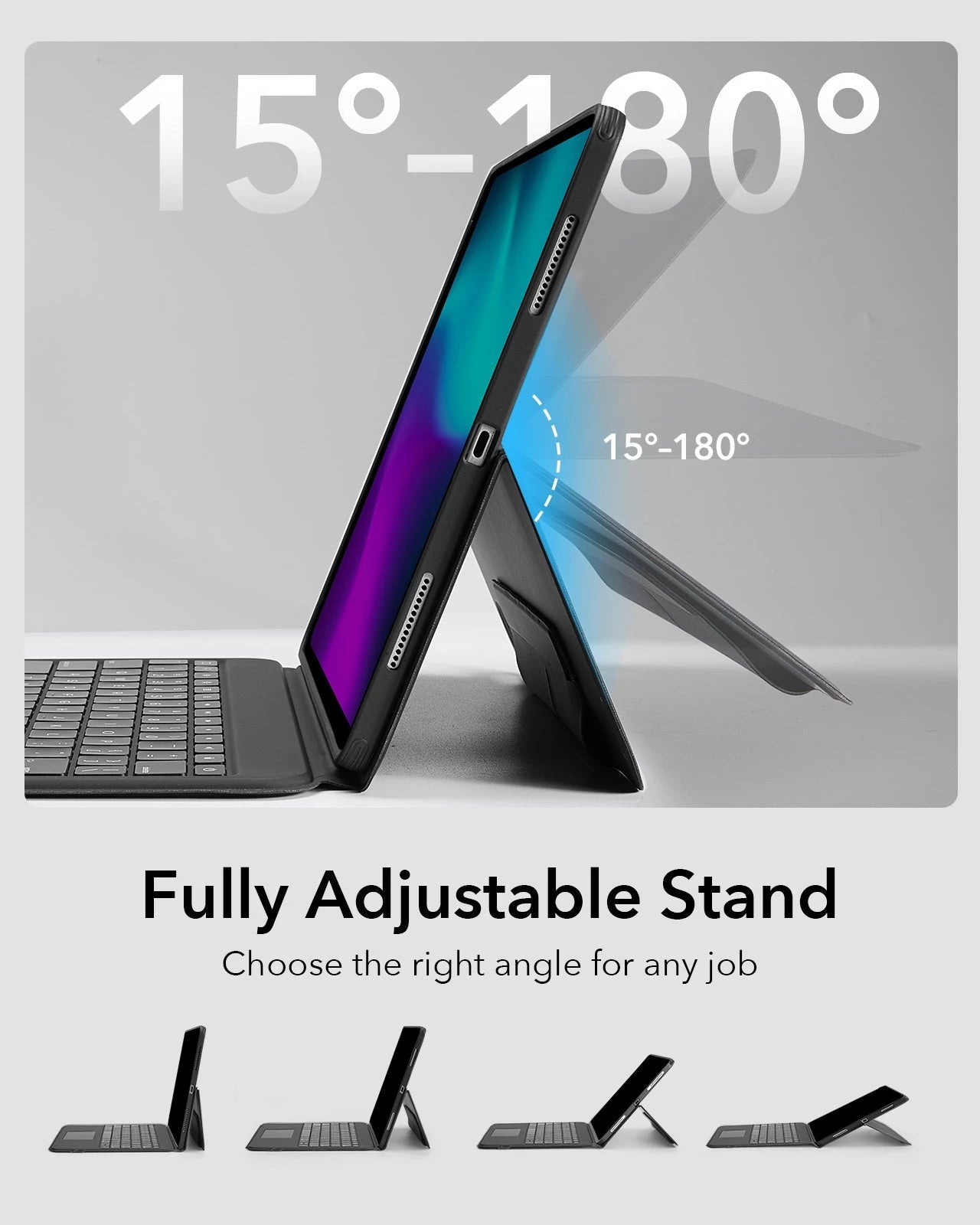 Soyez plus productif avec cet étui pour clavier à réglage multi-angle qui vous permet de travailler en mode portrait et paysage