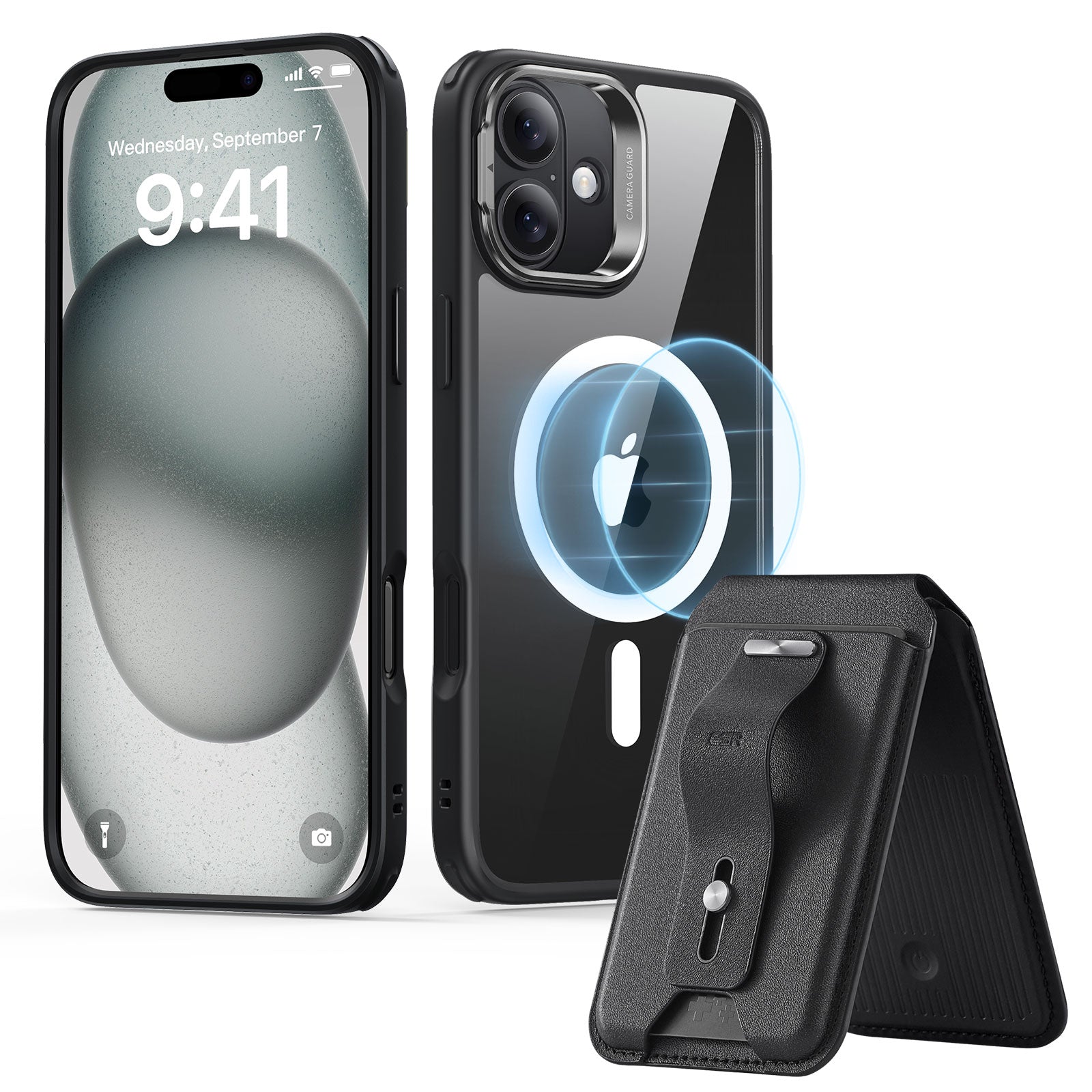 The ultimate everyday-carry set for your iPhone 16 Plus includes a super-protective clear MagSafe case and a premium vegan leather MagSafe wallet stand with full Apple-certified Find My