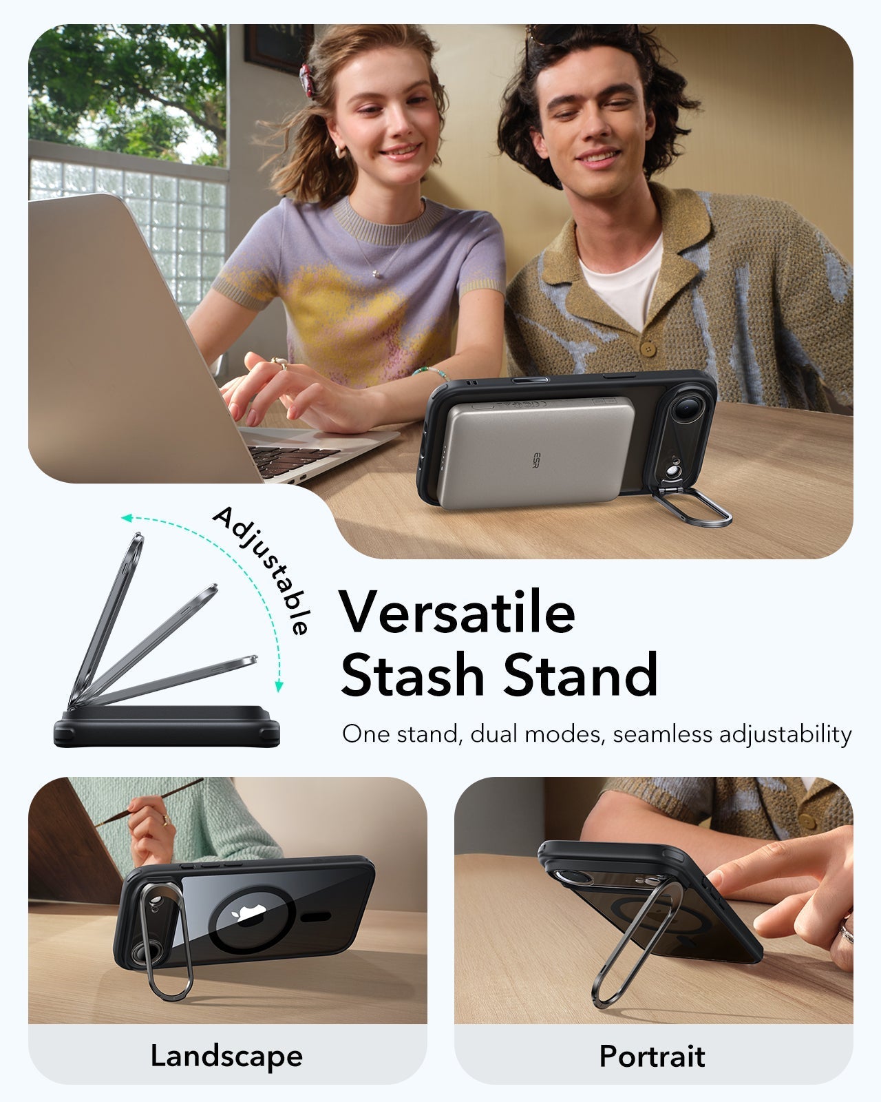 Fully Adjustable Stand: supports 15-69° viewing angles in both portrait and landscape orientations, ensuring stability and durability, while maintaining full MagSafe access