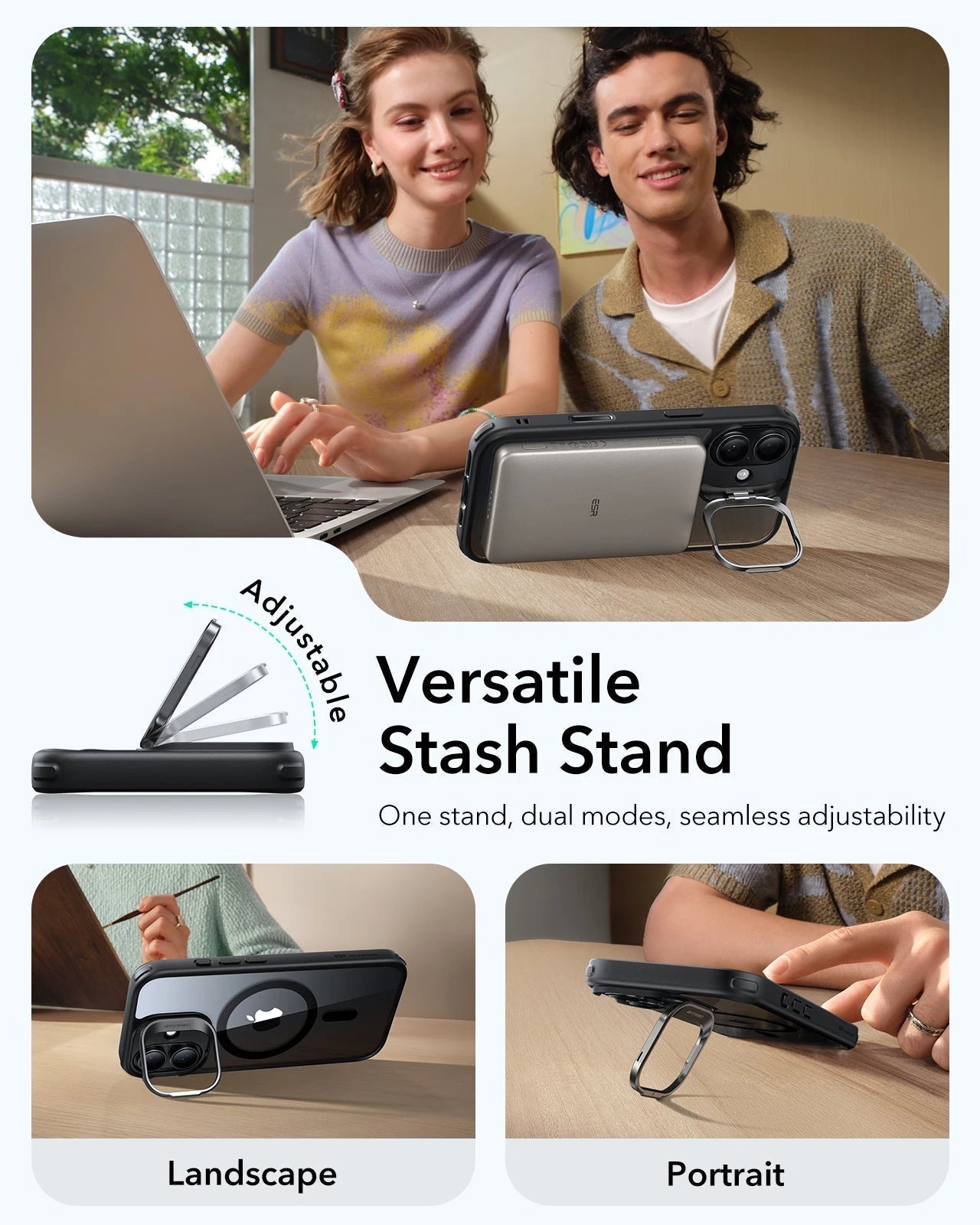 Fully Adjustable Stand: supports 15-85° viewing angles in both portrait and landscape orientations, ensuring stability and durability, while maintaining full MagSafe access